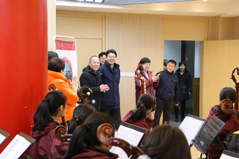 在尚美楼的江苏省音乐课程基地,李书记一行观看了民乐团和合唱团同学的排练,欣赏了民乐团演奏的《国风》和合唱团同学演唱的《捡螺歌》,对同学们精湛的技艺提出了表扬,对九中在江苏省中小学生艺术展演双双获得特等奖第一名表示祝贺,并预祝将要代表江苏在全国中小学生艺术展演中进行表演的民乐团和合唱团取得优异成绩。