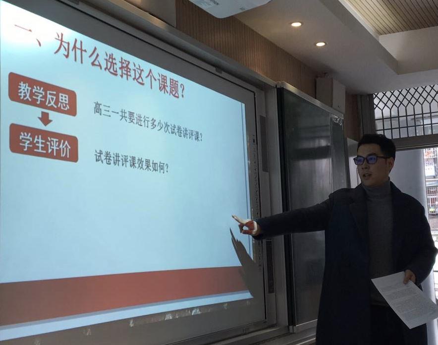 徐文晖老师课题名称为《能力立意导向的高三物理学情诊断与讲评教学研究》,他首先阐述了选择这个课题的原因以及利用智学网平台,凸显学生能力立意,构建新试卷讲评课模式的设想,接着进行了关键词解读和课题研究的过程和方法,以及相关理论依据,最后玄武区外国语学校屠磊磊校长就本课题进行了精彩点评,并提出宝贵建议和意见。