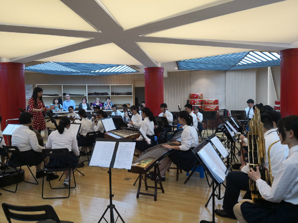 九中校长张恒柱、副校长诸谦和校办副主任王卓荣接待了远道而来的客人,并且带领他们观摩了篮球队训练,参观了校史馆,然后来到江苏省音乐课程基地,欣赏文艺中心合唱排练、民乐排练。九中男子篮球队连续十六年蝉联江苏省冠军,获得四次全国冠军;民乐团和合唱团多次在全国小学生艺术展演中获得一等奖。来访的客人们感受了学校在艺体特色教学上取得的突出成就,对中国学校的艺体高水平教学赞不绝口。