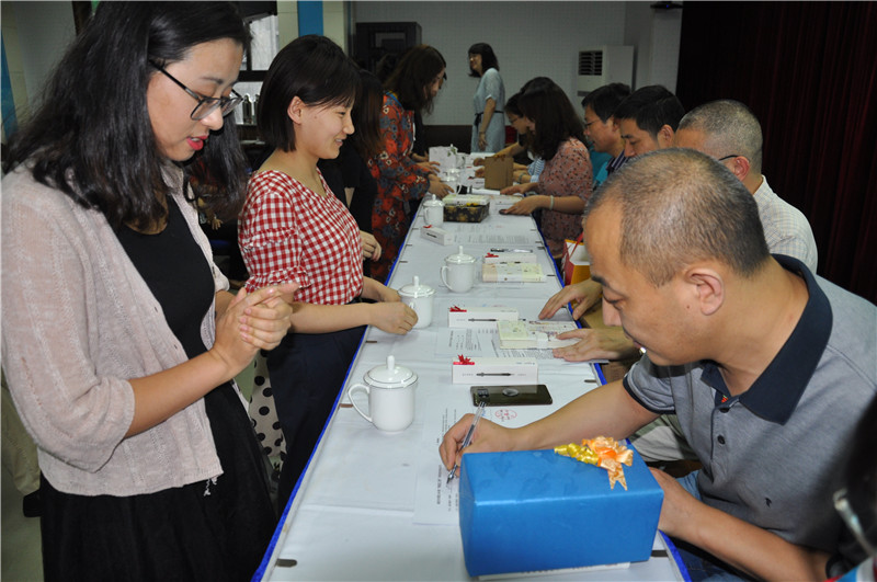 拜师仪式在音乐声中开始,师傅们在台上就坐,42位徒弟分批上台向自己的师傅敬茶拜师,送上了贴心的小礼物,感谢师傅在今后一年中对自己的辛苦指导;师傅们则赠给徒弟一支钢笔和一本笔记本,在笔记本的扉页上,师傅们都特意为徒弟写下了赠言,勉励徒弟们在教育教学中不断成长。