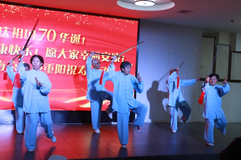 老教师们精心准备了文艺节目,简短的寒暄后,节目就开演了。围绕国庆的主题,老师们各展才艺,唱歌、跳舞、口琴、口哨、舞剑、拐棍操,节目精彩纷呈,赢得满堂喝彩。精彩的节目既表达了九中离退休的老师们赞美祖国,歌唱祖国的爱国之情,也展示了他们健康多姿的退休生活。