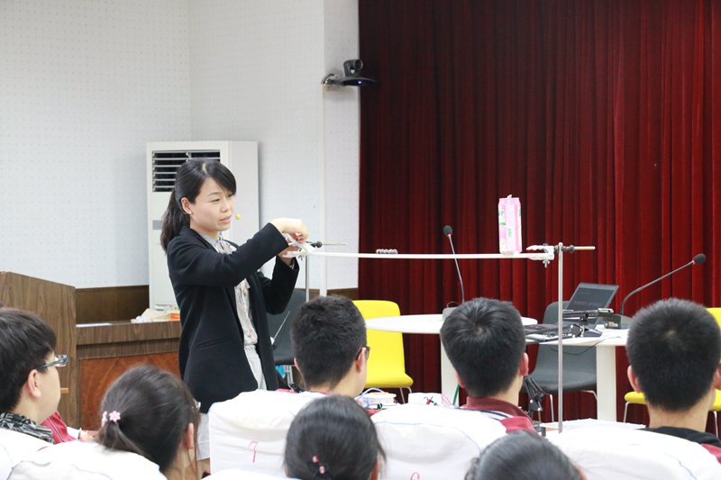 活动第一部分是南京九中倪凤老师开设《几种常见的磁场》展示课,倪老师利用磁体弹珠冲撞易拉罐实验,激发学生研究磁场的兴趣。进而利用示教板带领学生观察条形磁体周围的磁场分布规律,在此基础上引导学生思考如何研究长直导线周围的磁场,通过自制教具学生自主分析出磁场分布情况,进一步思考如果是环状线圈呢?最后倪老师利用数字化实验带领学生观察了螺线管内部的磁场分布规律。教学过程中倪老师利用直观的教具和科学实验视频让学生对抽象的磁场有了直观的认识和深入的理解。