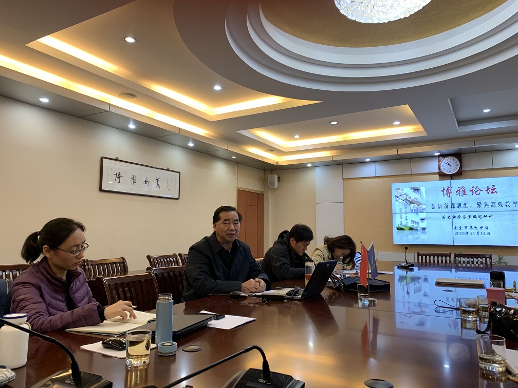 2019年11月14日,《创新备课思维,聚焦高效教学》历史组学历案编写研讨会在南京九中如期举行。南京市历史教研员袁廷虎老师、南京市玄武区教研员周萍老师莅临指导。周萍老师首先针对三个历史备课组上缴的历史学历案进行了详细的点评,表扬历史组学历案设计精巧、结构完整、内容充实、贴近学情,是符合学校要求的优秀学历案。袁廷虎老师进一步对三个历史备课组的日常教学工作和学历案编写工作进行了深入的指导。他指出,教学工作和学历案的编写工作都必须做到务实求真,要具体做到如下几个方面。第一,学科核心素养要体现出教学目标和课件中,贯穿整个教学活动。第二,情境设置要符合学情,旨在培养学生的学科核心素养。第三,多媒体信息技术要熟练运用,使课堂容量充足。第四,框架结构要理清模块间的逻辑联系。第五,反馈训练要精讲精练,及时巩固学习内容。历史组全体老师参加了本次研讨会,对会议内容做了认真的记录,并以备课组为单位进行了小组讨论,反思了教学工作和学历案编写工作中的问题,对标找差,同时制定了下阶段的教学计划。