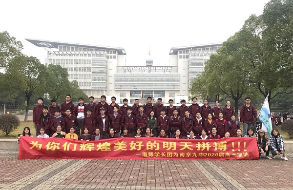 下午12时许,同学们从南大出发,在年级主任的统一领导下,由班主任和家长陪伴,徒步依次穿越南京大学、南京邮电大学、南京财经大学,最终会师于南京师范大学。期间,南京九中“学长团”的师兄师姐们在各高校内拉起横幅,以此方式欢迎同学们的到来并预祝大家在明年的高考中取得理想成绩,进入心仪大学。
