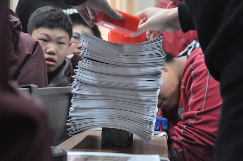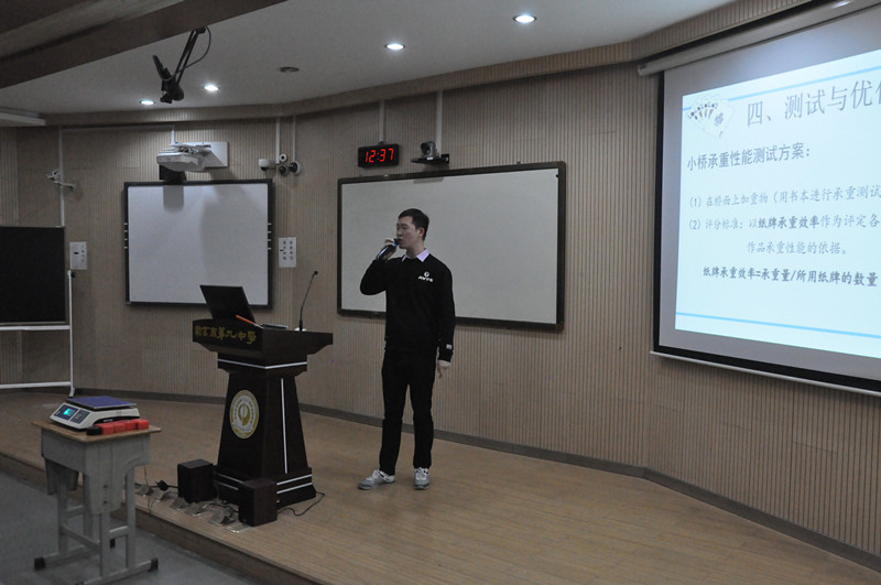 最后,在每个小组制作的纸牌桥上进行了承重测试,以纸牌承重效率(承重量/所用纸牌的数量)作为评定各小组作品承重性能的依据。各小组也推选出一名同学代表从承重性能与作品外观两个方面进行组内自评和组间互评。
