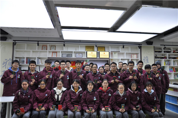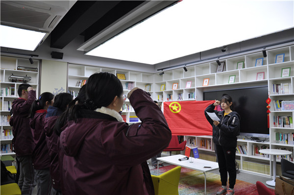 校团委书记张瑞寒老师宣读了《共青团南京市第九中委员会关于2019年12月发展新团员的决定》文件。接着,张瑞寒老师为新团员佩戴团徽、颁发团员证、团章。全体团员在2019届优秀毕业生、玄武区优秀共青团员陈可欣同学的领誓下,庄严地宣读了入团誓词。新团员代表高三(14)班严子渊同学、老团员代表陈可欣同学分别发表感言。