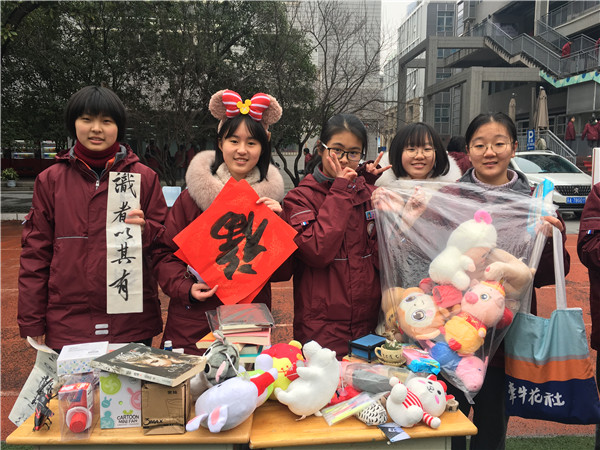 2020年1月17日上午,高一、高二同学以班级为单位,在学生会的组织下,于学校大操场主席台前摆开摊位,同学们拿出事先准备捐出的书籍、小摆设等物品,吆喝起来。活动中同学们脑洞大开,创意十足,有写春联卖“字”的,有弹吉他卖“艺”的,还有假玩偶卖“合影服务”的,甚至还有把“套圈”游戏搬到现场的。爱心义卖的同时,九中的多个社团如舞团、音乐社、动漫社等均为同学们带来精彩的社团表演。在动感的音乐声中,同学们可以走出教室,来到义卖场地,一边欣赏文艺节目,一边选购心仪的物品。在享受难得的休闲时光的同时,也为义卖活动献出了爱心。看,学生会的摊位被同学们层层包围,老师们的“墨宝”新年祝福被抢购一空,学校的明信片也是热销产品,与九中合作多年的文具店“甲午小站”也免费赞助了品种多样的物资,深受同学们喜爱。