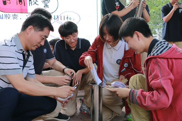 在“看明朝,诗书凌云壮志酬”的第三篇章,年级部启动时间胶囊,班长和班主任一起将每位同学致十年后自己的一封信封存入囊,开启十年之约。最后,高三年级部主任金玉明老师在展开的巨幅标语前以饱满的热情再次为全体高三同学加油鼓劲:破釜沉舟搏一月日出日落,背水一战拼三载无怨无悔。2020,圆梦碑亭,誓师活动在有力的呐喊、热烈的欢呼声中落下帷幕。