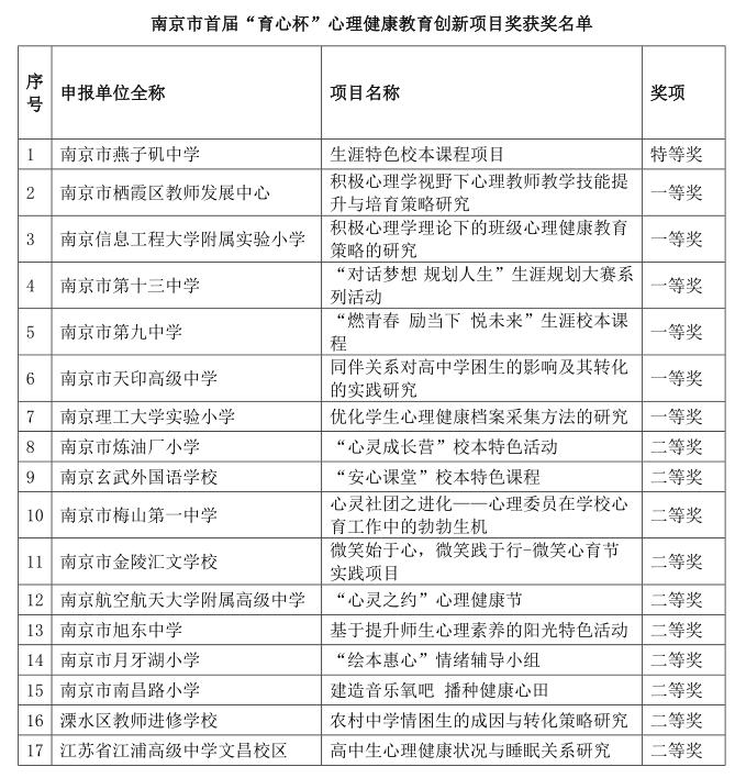 南京市首届“育心杯”心理健康教育创新项目经过区评审及推荐,共有23个项目通过初评参加市级评选。经南京市教育科学研究所、南京市心理健康教育指导中心组织相关专家评审,共评出市特等奖1项,市一等奖6项,二等奖10项。