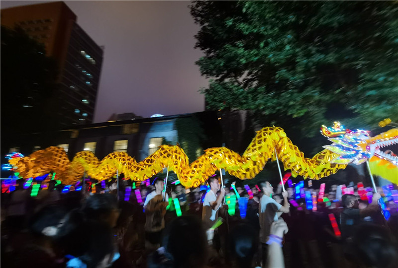 歌曲结束时,远处的十五位手提鲤鱼灯笼的少年吸引了全场的注意力,十五位同学象征着高三年级的十五个班,他们簇拥着年级主任金玉明老师步步高升,来到了“九苑”的三楼平台,转瞬间,鲤鱼变成了“龙”。金主任和篮球队队员组成了临时的舞龙队绕场一周,龙头所到之处荧光棒高高举起,是人浪也是后浪。