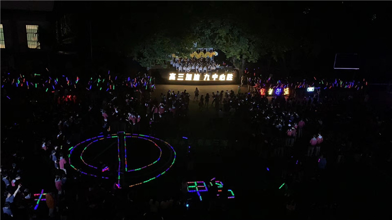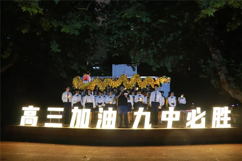 最后,在全场的齐声呐喊中,在广播台里传出的温暖的祝福中,主席台前的花灯和立式灯牌逐一点亮“高三加油,九中必胜”。