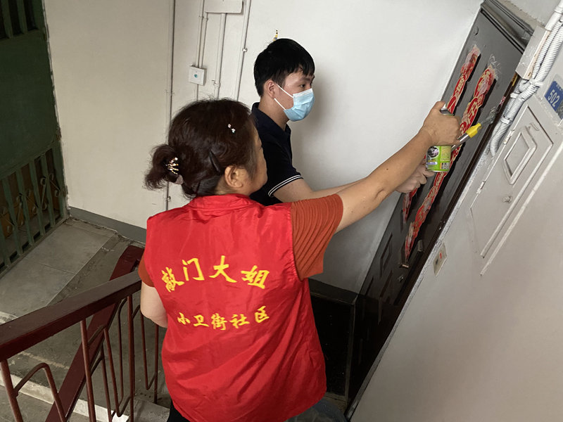 同学们在小卫街社区副书记仇玲子带领下,身着红马甲,佩戴红袖章,分成两组,铲除居民楼内小广告,整理乱排乱放的非机动车,为改善小区环境卫生出一份力。