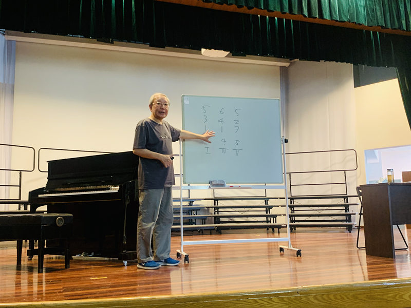 冯教授向老师展示了西洋大小调钢琴伴奏的基础伴奏和弦,分别是主和弦,四级和弦和半终止的五级和弦。他运用这三个和弦的原位或转位,即兴对多首歌曲进行伴奏。并且通过分解和弦和柱式和弦改变伴奏的色彩,让现场老师们领悟到到即兴伴奏的奥秘所在。