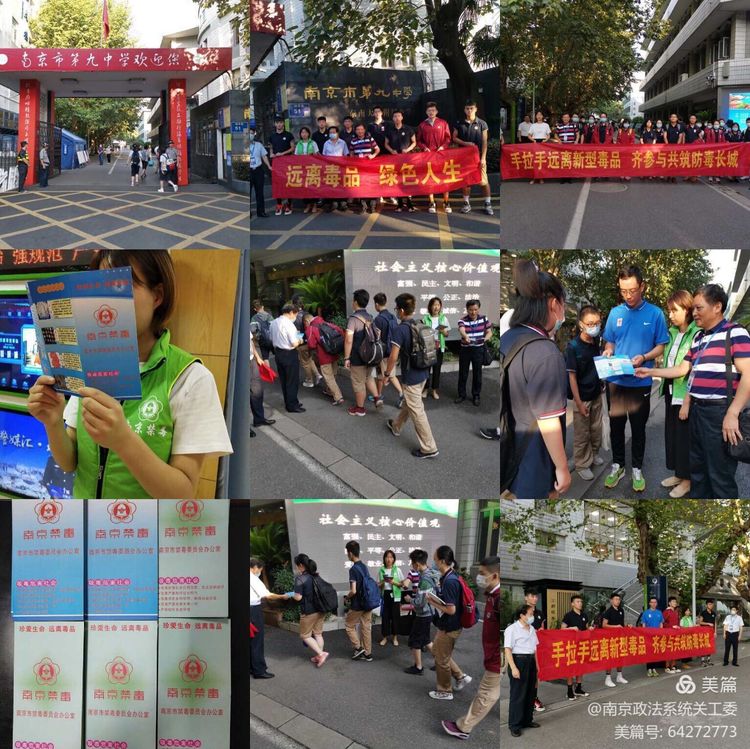9月3日上午,新街口派出所关爱工作站在站长(派出所教导员赵宁)协调下,关爱工作站副站长周献杭、王德春及参加关工工作老同志叶刽平、张树华和新街口街道司法所所长王娴竹、专职禁毒社工刘希一起来到长江路碑亭巷51号南京市第九中学,开展禁毒宣传,向同学们宣传讲解禁毒工作的重要意义,认真学习禁毒法,开展珍惜生命,远离毒品主题教育,坚决抵制毒品侵害,珍惜美好年华,树立正确人生观,价值观,增加学生们对祖国的责任感和使命感。通过宣传,告诉学生,一次吸毒,终生后悔。此次活动,关爱工作站、司法所在九中校领导范主任支持下,与学生开展良好的互动,拉横幅,发放禁毒宣传手册,校领导、老师及学生们普遍感到效果不同反响。此次活动禁毒大队关爱工作站副站长徐彪到场指导!