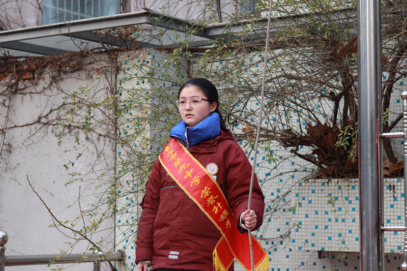 2021年1月11日,南京市第九中学长江路校区举行“艰难方显勇毅,磨砺始得玉成”主题晨会,由全校师生参与。本周的升旗手是来自高二(13)班的李想同学。