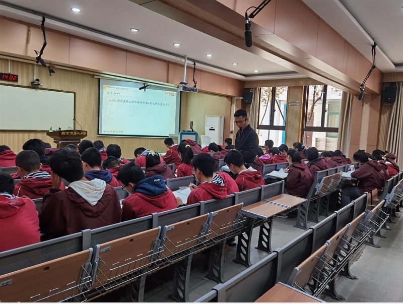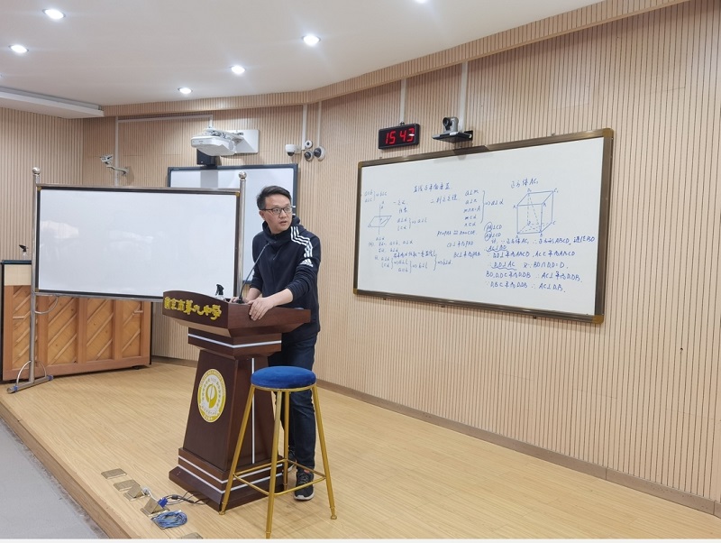 管恒铭老师开设题为 《直线与平面垂直》公开课。本节课中管恒铭老师从实际生活出发,抽象出数学问题,合理地使用实物教具。在例题处理上,由条件正向联想,逐步探讨,设这梯度问题,引发思考,同时还培养了学生方法的选择。