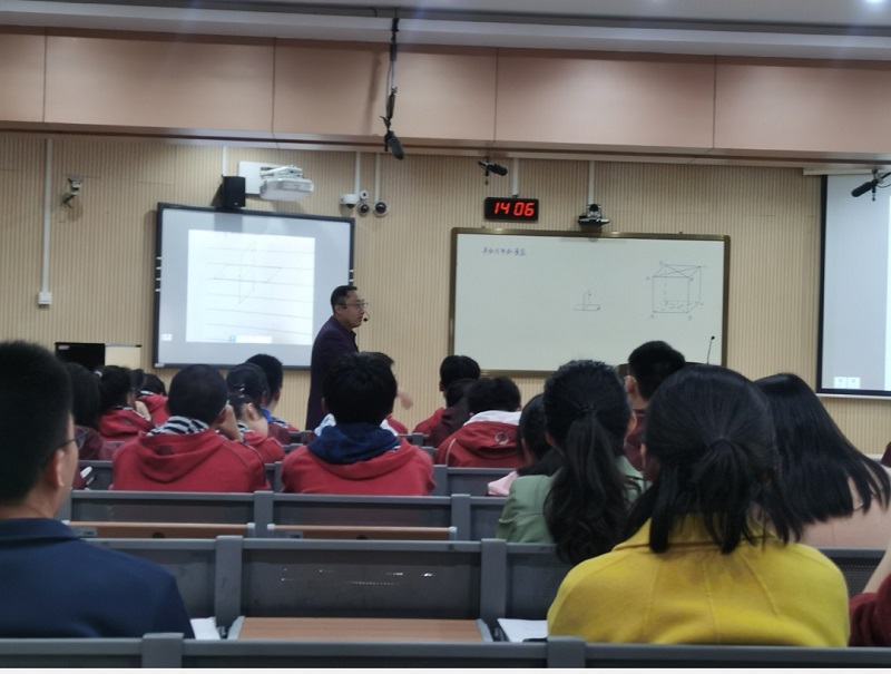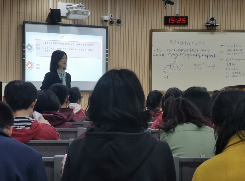 张佩林老师从面面垂直的实例出发,逐步引导,注重培养学生的空间思维和立体几何的空间想象能力,逐层递进,通过实物展示,师生互动,得到面面垂直的判定定理。整节课课堂氛围活跃,学生得到了充分的展示机会。