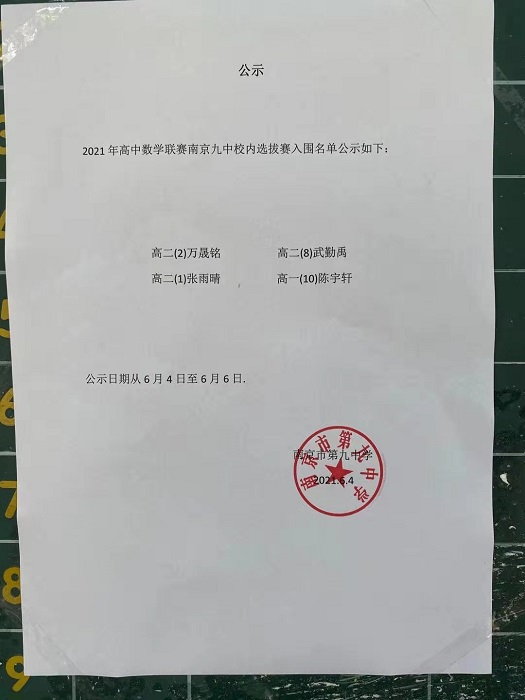 2021年6月1 日南京九中举行2021年全国数学联赛校内选拔考试,本次考试在胡吉蔚老师的组织下有序展开。我校学生非常积极踊跃的参与其中,高一、高二年级共71位同学参加考试,经过激烈角逐,最终四位同学脱颖而出,他们是:高二(2)万晟铭、高二(2)武勤禹、高二(1)张雨晴、高一(10)陈宇轩。
