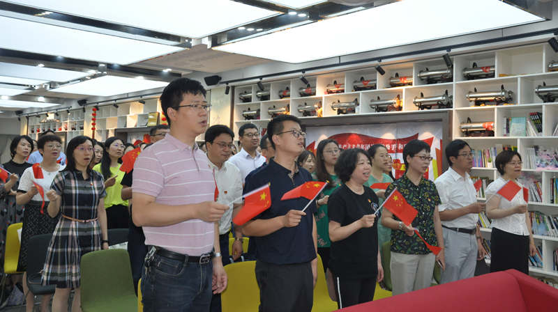 在庆祝中国共产党成立一百周年大会结束之后,南京市第九中学全体共产党员在博雅厅开展学校党员庆祝中国共产党成立一百周年大会。全体共产党员手握红旗,胸佩党徽,唱着红歌,庄严肃穆,牢记初心使命,坚定理想信念,为实现中华民族伟大复兴而奋斗。