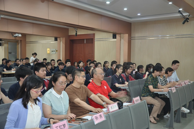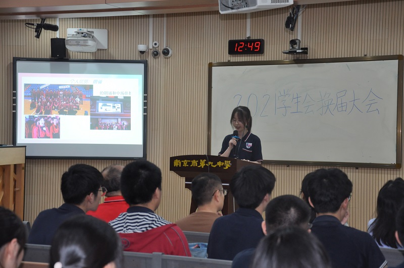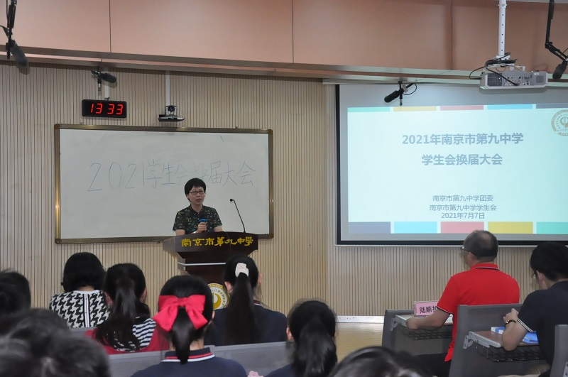 2021年7月7日中午12点20,南京市第九中学学生会在弘光楼106举行换届竞选大会。出席本次换届大会的有学校的领导老师们、高二部长、高一全体学生会干事以及高一各班级学生代表们。
