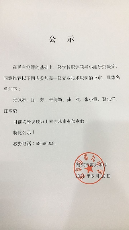 南京市第九中学2019年公开招聘教师拟聘用人员递补名单公示