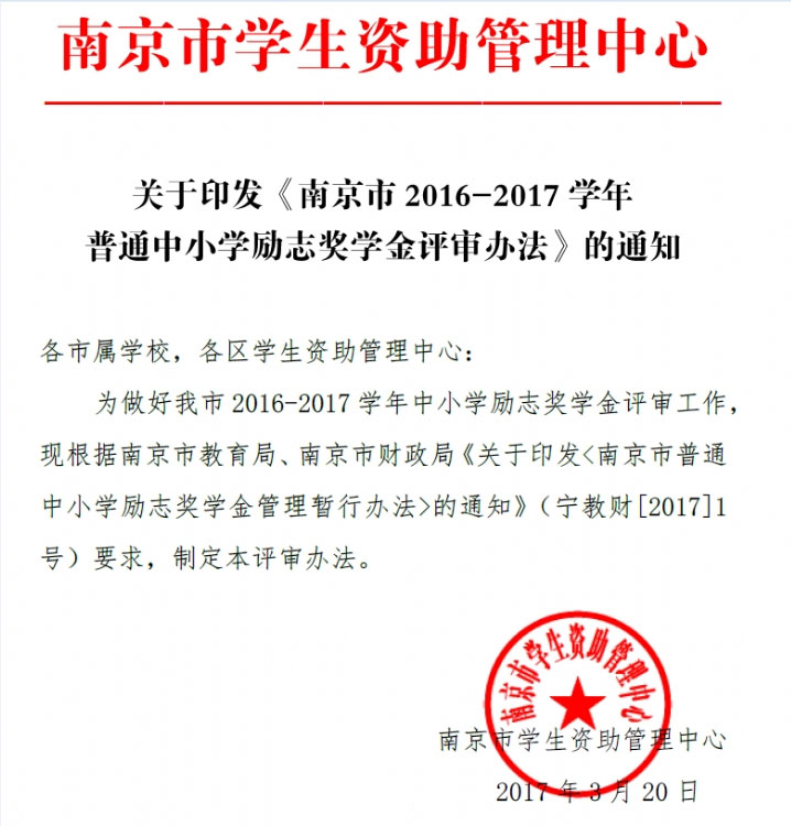 南京市2016-2017学年普通中小学励志奖学金评审办法