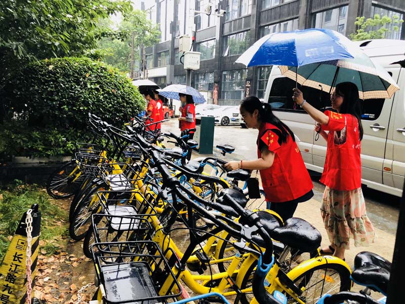 下午2点,参与本次活动的高三党员教师来到长江路社区集合。天公不作美,尽管下着小雨,也没有浇熄大家参加志愿服务的热情。大家纷纷穿上了标志志愿者身份的红马甲,戴上红袖章,来到长江路上共享单车停放区域,开始了本次排放整理单车的服务活动。
